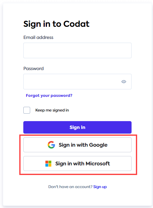As long as the email addresses are the same, attempting to sign in with a Google or Microsoft account will automatically linkLink The authorization flow that allows end users to connect their accounting, banking, or commerce platforms to your application via Codat. the account to the existing Codat account. Users must first have been invited to use Codat with the same email address that they use to access the third-party account (Google or Microsoft).