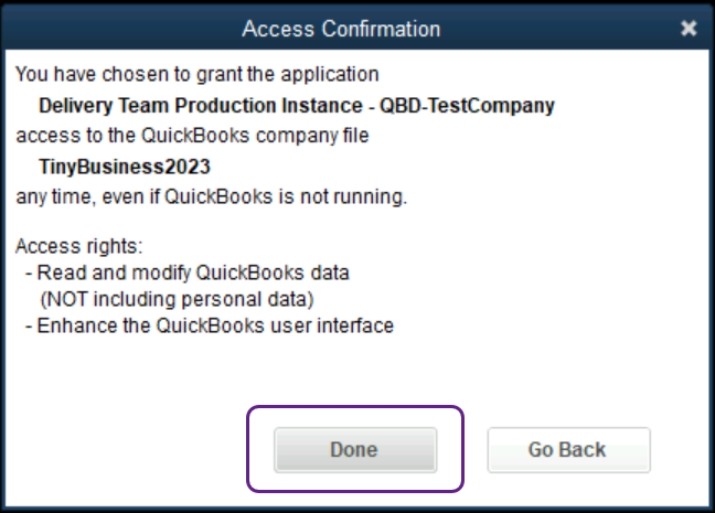 The user should select Yes, always; allow access even if QuickBooks is not running to enable the connector to work.